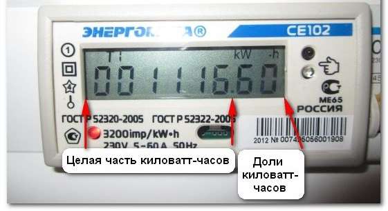 - Запишите все цифры, которые видите на табло, слева направо. Не обращайте внимания на цифры, выделенные другим цветом (обычно красным) или отделенные запятой – они показывают десятые доли киловатт-часа и не учитываются при передаче показаний.