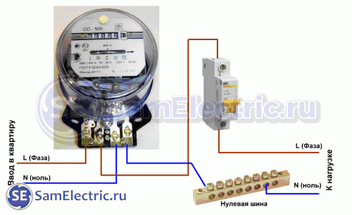 Схема подключения однофазного счетчика обычно выглядит следующим образом: