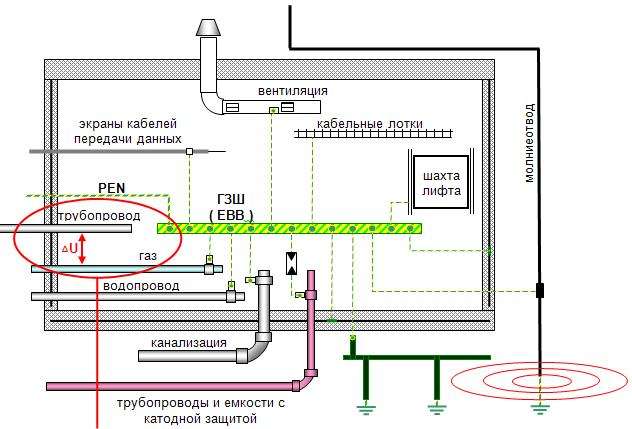 - Металлические трубы коммуникаций, входящие в здание (водопровод, отопление, газопровод).
